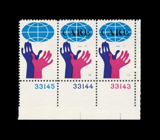 1496 nh 1439a image#1439a, 8c CARE, black omitted, bottom right corner sheet-margin transitional horizontal strip of three, with three plate numbers showing, the first stamp being the error, with the second and third stamps with black partially omitted, fresh, exceptionally well centered, o.g., n.h., extremely fine; one of the most desirable of all the color omitted errors, with only ten examples recorded; 1992 PF certificate. (Image) 4,750.00+