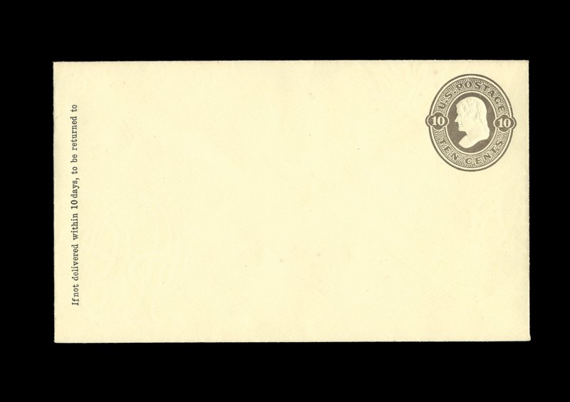 1662 ogc U90 image#U90, 10c Olive black on amber, die 39, size 7, knife 25, wmk. 2, an exceptional quality mint entire, with vertical printed return address as always, marvelously fresh and bright, superbly detailed embossing on immaculate paper, extremely fine; especially scarce and desirable this choice (UPSS #226a). (Image) 1,250.00