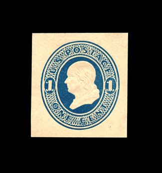 1663 og U110 image#U110, 1c Dark blue on cream, mint cut square, measuring 31x34mm, insignificant small pen mark on reverse, very fine; a rare cut square, as no entires of this are thought to exist; clear 2001 PSE certificate. (Image) 1,600.00