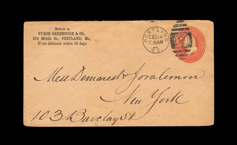 1672 PBPBPB U230 #U230, 2c Red on fawn, used entire to New York City, postmarked with "Portland, Me./Dec 14 (1883)" duplex cancel, confirming 1883 year date receiving mark on reverse, representing the earliest documented usage of Scott #U230, couple of trivial opening edge tears at top, very fine; stamped entire earliest documented usages from this period are quite elusive; 2000 APS certificate. (Image) Est. 400-500