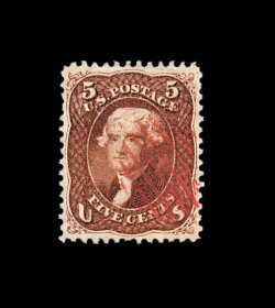 1076 O 75 image#75, 5c Red brown, a striking used single that is among the very few available that can be considered a true jumbo example, boasting extravagantly large margins that are most uncharacteristic of this notoriously difficult stamp, and being virtually perfectly centered within these impressive borders, lovely rich color and a clean impression on bright paper, neat town c.d.s. and just a trace of a red cancel as well, extremely fine; a large-margined used gem; 2001 PF certificate. (Image) 475.00
