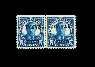 1782 og 86b image#86b, 5c Blue, "Canal" inverted, horizontal pair, positions 7-8LR, position 7 being the error, well centered, deep color, slightly tropicalized o.g., very fine; only 32 examples are recorded; ex-Plass and illustrated in Canal Zone Stamps. (Image) 950.00