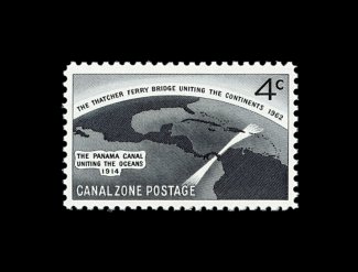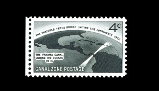 1788 nh 157a image#157a, 4c Black, Thatcher Ferry Bridge omitted, position 18, a superb mint example of this, one of the most famous printing errors in philately, flawlessly centered within large margins, brilliantly fresh, o.g., n.h., an extremely fine gem; one full sheet of 200 (which was cut into four panes of 50) was inadvertently printed without the silver bridge, only one of these panes of 50 ever made it into the public's hands, in this case the famous stamp dealer H.E. Harris, who successfully sued the Canal Zone Postal Administration preventing them from deliberately printing tens of thousands of similar errors (much like the famous U.S. Dag Hammaeskjold error), of the three panes that never made it into the public's hands, one pane of 50 each were laminated and donated to the Smithsonian Institution and the Canal Zone government, while the third pane was destroyed, leaving 50 stamps for the collecting public; this is position 18 (as indicated by a small light pencil position number on the reverse of the stamp) and is accompanied by a 1992 PF certificate. (Image) 7,500.00