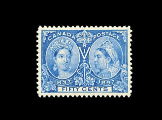 2061 nh 60 image#60, 1897 50c Jubilee, an outstanding mint single in a quality that is rarely encountered on any Jubilee stamp, as this stamp possesses exceptionally large margins and is remarkably well centered within them, plus its color is especially rich and its paper unusually crisp and white, clean o.g., n.h., extremely fine; a truly rare stamp in this superb condition; 2001 PF certificate (Unitrade C$675.00). (Image) 550.00