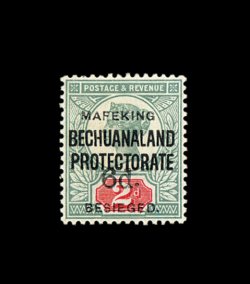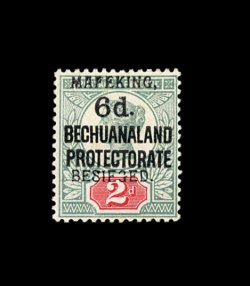 2068 og #174 image#174, 1900 "Mafeking/6d./Besieged." surcharge on 2p Green and carmine, a particularly well centered mint single, fresh with strong bright colors, o.g., very fine and choice; 1991 BPA certificate (S.G. #13; £1,100). (Image) 1,200.00