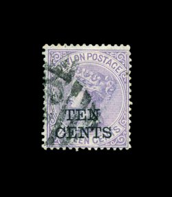2070 O 101 image#101, 1885 "Ten Cents" surcharge on 16c Violet, a select used example of this surcharged value that is very scarce mint or used, portion of oval numeral cancel in bars, attractive pastel color, very fine; a difficult value missing from most collections; signed A. Brun and accompanied by a 1998 Brandon certificate (S.G. #161; £1,600). (Image) 1,500.00