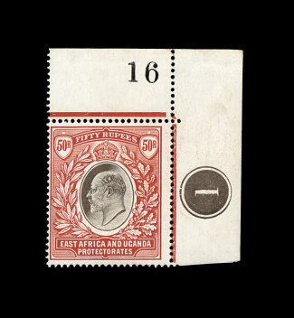 2074 nh 30A image#30A, 1904 50R Orange brown and black, an impressive top right corner sheet-margin plate no. 1 single with control number, exceptionally fresh with bright white chalky paper, rich sumptuous colors, centered a bit to the left, o.g., stamp is never hinged, being hinged in selvage only, very fine (S.G. #33; for hinged £1,300). (Image) for hinged 1,200.00