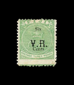2078 og 24 image#24, 1874 "Six/Cents" surcharge on 3p Green with Gothic "V.R." overprint, a scarce mint single, centered into perfs. at top as is often the case with these issues, o.g., h.r., fine for this; a total of only 1,675 stamps were issued and most of these were used; 2002 Brandon certificate (S.G. #17; £1,400). (Image) 1,100.00