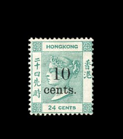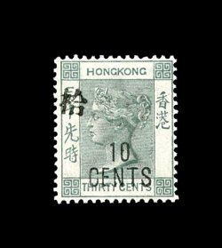 2116 og 69a image#69a, 1898 "10 Cents" surcharge on 30c gray green, with large Chinese character, fresh mint single, well struck overprints, quite well centered for this, good color, o.g., h.r., very fine (S.G. #55c; £900). (Image) 1,250.00