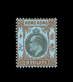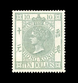 2112 ng 59 image#59, 1892 $10.00 Gray green, an extraordinarily impressive unused example of this major Hong Kong rarity, exceedingly well centered, showing wide even margins on bright white paper, and surrounded by full even perforations, very pleasing pastel color with clear detailed impression, extremely fine; an incredibly rare postal fiscal that is rare in any condition, but particularly so this choice; 1978 RPS certificate (S.G. #F6; £11,000). (Image) 11,500.00