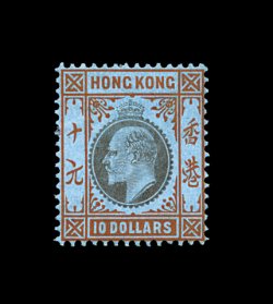 2118 og 108 image#108, 1904 $10.00 Orange and black on blue, lovely mint single with particularly strong colors including the blue paper, very well centered for these tightly spaced issues, especially fresh, o.g., choice very fine; a premium example of the scarcer of the two $10.00 values (S.G. #90; £1,500). (Image) 1,300.00