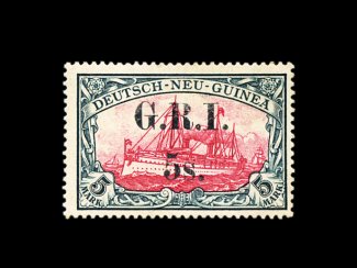 2162 og 15 image#15, 1914 "G.R.I./5S." surcharge on 5M Slate and carmine, narrow 4mm spacing, lovely mint example of this rare and beautiful high value, gorgeous rich colors, quite well centered, clean o.g. that has been lightly hinged, accompanying certificate states there is a "small vertical crease at top", which is nothing more than a trivial gum wrinkle in our opinion, very fine: it is believed that no more than a mere 35 stamps of German New Guinea were surcharged of the combined both spacings; 1991 PF certificate; ex-Gibralter (S.G. #15; £6,500). (Image) 6,000.00