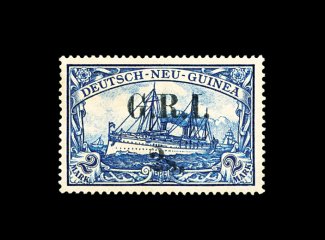 2163 og 28 image#28, 1914 "G.R.I./2S." surcharge on 2M Blue, wide 5 1/2mm spacing (setting 2, position 3), exceptionally well centered mint single, sumptuously deep color and sharp impression, slightly disturbed o.g., extremely fine; it is believed that no more than 75 stamps of German New Guinea were surcharged of the combined both spacings; double signed Champion and Kilian BPP, accompanied by the latter's 1985 certificate; ex-Gibralter (S.G. #28; £2,750). (Image) 2,500.00