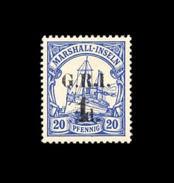 2168 og 45 image#45, 1915 "1" surcharge and "G.R.I./2d."surcharge on 20 pf Ultramarine, an amazing mint example of this very rare twice surcharged issue, wonderfully well centered and surrounded by full even perforations, brilliant color on fresh white paper, o.g., lightly hinged, extremely fine; exceptionally rare with only 50 stamps originally printed, and particularly so in this premium condition; 1992 RPS certificate (S.G. #64; £3,000). (Image) 3,000.00