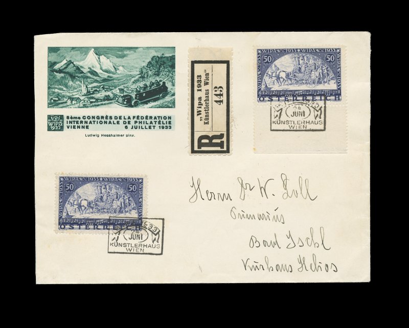 2312 c B110, B110a #B110, B110a, 1933 50g WIPA and ordinary and granite paper, bottom sheet-margin single of the former, single of the latter, tied by special WIPA exhibition cancels on registered cover, both stamps well centered, there is just the faintest trace of a toned perf. tip to the granite paper stamp (mentioned only for strict accuracy), still an especially fresh and very fine cover (Michel #555A, 556A; for used €850). (Image) as used 615.00