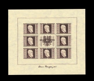 2316 nh B185-88 image#B185-88, 1946 1s+1s to 5s+5s Renner souvenir sheets cplt., fresh o.g., n.h., 3S+3S with small facial rub at left not affecting the stamps, otherwise a very fine set (Michel #772B-75B; €2,600). (Image) 2,000.00
