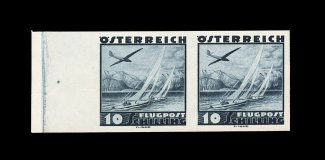 2319 nh C32-46 vars. image#C32-46 vars., 1935 5g-10S Airplanes, imperforate cplt., matched set of left sheet-margin horizontal pairs, large margins all around (20g cut a little short at top), strong rich colors, o.g., n.h., extremely fine (Michel #598U-612U; €840). (Image) 650.00