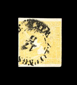2320 O P2 image#P2, 1851 (6kr) Yellow newspaper stamp, mostly full to large margins all around, just barely touching the design at bottom right, strong color for this (not the faded shades that are often found), Vienna double ring cancel, nearly very fine; a highly collectable example of this rare classic stamp; signed Senf, Friedl, and accompanied by a 1983 Friedl certificate (Michel #7; €8,500). (Image) 7,000.00