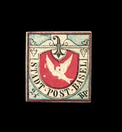 2538 ng 3L1 image#3L1, 1845 2 1/2r Black, crimson and blue Basel Dove, a seldom seen unused example of this classic, being one of the few sound unused examples in existence, without gum, margins range from ample to full, strong fresh colors and with detailed embossing, a very fine example of this important rarity; signed H. Bloch, Calves and J. Schl(esinger), as well as being accompanied by a 1987 Rellstab certificate (Zumstein #8; 18,500SF). (Image) 11,500.00