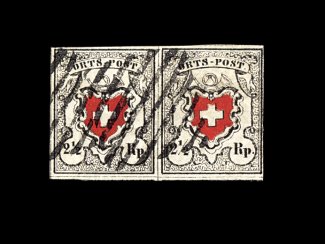 2539 O 1 image#1, 1850 2 1/2r Black and red, with frame around cross, very scarce used horizontal pair, positions 22-23, four full to mostly large margins, including showing full dividing lines at left and at bottom, unusually fresh, strong clear impressions on bright paper, neat crisp strikes of of rimless grid postmarks, very fine; 1991 Rellstab certificate (Zumstein #13I; 5,000SF for a pair). (Image) 2,800.00+