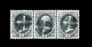 1169 O 151 image#151, 12c Dull violet, handsome used horizontal strip of three, excellent centering throughout, strong rich color, each stamp with neat central strike of a quartered cork pmk., very fine-extremely fine; impressive quality for a used Bank Note multiple; 2001 PF certificate. (Image) 510.00+