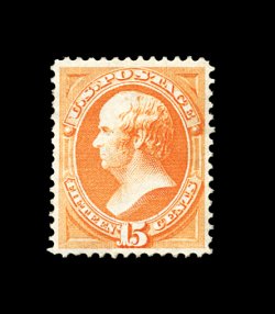 1177 og 163 image#163, 15c Yellow orange, extraordinarily well centered within large margins, vivid color, full o.g. which is a bit disturbed, light diagonal crease at top left, otherwise extremely fine for this rare mint stamp; 2003 PF certificate. (Image) 2,250.00