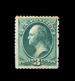 1180 og 169 image#169, 3c Blue green special printing, without gum as issued, an extraordinarily well centered and margined example of this important special printing rarity, being not only far better centered and margined than normally found, but this is also among the few existing examples whose perforations are essentially intact despite having been scissor separated as customary, deep luxuriant color, mild overall toning, otherwise extremely fine for this value; only approximately 35 to 40 Three Cent Hard Paper Special Printings are thought to still exist. (Image) 15,000.00