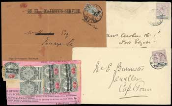 136 : width="300p" alt="image" ></a></cfif>Bechuanaland Covers and Cancellations 1889 (Jan.) envelope from Vryburg to Port Elizabeth bearing 1888 (Aug.) 2d. on 2d. cancelled with first type c.d.s., Kimberley and Port Elizabeth c.d.s. on reverse; despite