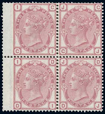 136 : width="300p" alt="image" ></a></cfif>1873-80 Large Coloured Letters 3d. pale rose, plate 19, CI-DJ block of four with wing margin at left, light vertical bend at left in the margin, fresh and fine with part original gum. S.G. 144. Photo Estimate