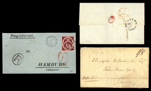 137 : postal markings; 1842 (7 Dec.) entire to London, rated "1/-" and showing, on reverse across flap, small St. Kitts fleuron d.s. showing last two digits of year only. Also St. Vincent 1896 envelope (addressee´s name scratched out) to Germany bearing