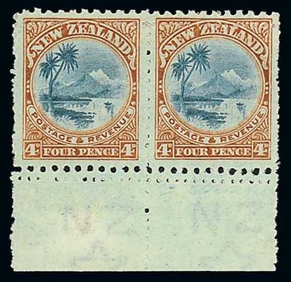 136 : width="300p" alt="image" ></a></cfif>— 4d. blue and yellow-brown marginal pair from the foot of the sheet, perforated 14 and with lines of perf. 11 across top (officially patched) and foot, fresh mint; some perfs. severed at foot. S.G. 342,