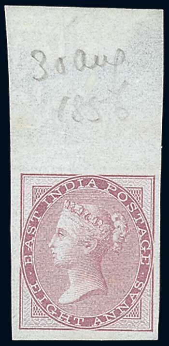 136 : width="300p" alt="image" ></a></cfif>8a. carmine marginal single from the top of the sheet, variety imperforate, fresh with large part original gum and mounted in margin only, deep rich blueing on reverse; trivial creasing though a spectacular