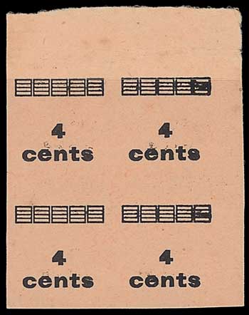136 : width="300p" alt="image" ></a></cfif>Kenya, Uganda and Tanganyika 1919 (7 Apr.) 4c. on 6c., a marginal plate proof block of four of the surcharge with an additional albino impression of each, in black on buff wove paper; some creasing affecting the