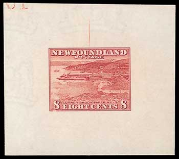 136 : width="300p" alt="image" ></a></cfif>NEWFOUNDLAND Later Issues 1932-38 Issue 8c. die proof in brownish-red on wove watermarked paper (56x49mm.) showing guide mark and part reversed die number. Photo Estimate £ 100-120<A