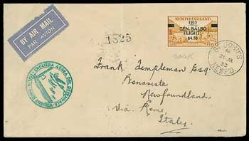 137 : Crociera in blue-green and, on reverse St. John's Registered, Shoal Harbour and three Italian c.d.s. Bolaffi Certificate (1965). Photo Estimate £ 250-300<A HREF="https://d3ums4016ncdkp.cloudfront.net/auction/main/3025/3025_693_1.jpg"