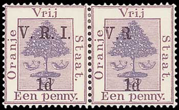 136 : width="300p" alt="image" ></a></cfif>Orange Free State 1900 British Occupation, First Printings 1d. on 1d. purple horizontal pair, the right-hand stamp with variety "I" omitted and no stop after "R", fresh mint. Scarce. Sc. 45b; S.G. 102g,
