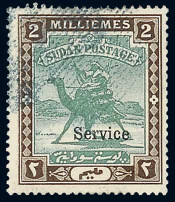 136 : width="300p" alt="image" ></a></cfif>SUDAN Army Service Stamps 1906-11 Watermark Multiple Star and Crescent 2m. green and brown showing variety "Army" omitted, fine used with "retta" cancel. Rare. Sc. MO6b; S.G. A7b, unpriced. Photo Estimate £