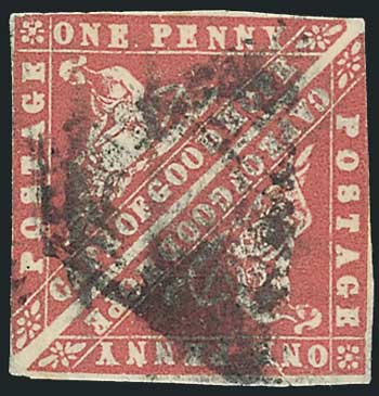 136 : width="300p" alt="image" ></a></cfif>CAPE OF GOOD HOPE 1861 "Woodblock" Issue 1d. vermilion pair, margins on two sides, touched in places on the others, heavily cancelled; one with tear and crease. S.G. 13, £4500. Photo Estimate £