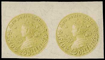 136 : width="300p" alt="image" ></a></cfif>NEW SOUTH WALES Five Shillings Coin Imperforate Plate Proofs In olive-yellow, a horizontal pair on Large Star watermarked paper; horizontal crease clear of impressions. Photo Estimate £ 400-500<A