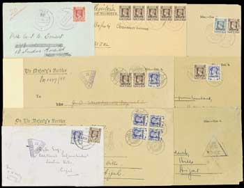 136 : width="300p" alt="image" ></a></cfif>BURMA The Chin Hills District Falam 1942 (8 Sept.) brown OHMS envelope (230x101mm.) registered to Aijal, bearing Official 1a. purple-brown strip of five thrice neatly cancelled with registered double-ring d.s.,