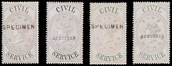 APPROPRIATED AND DESIGNATED ISSUES CIVIL SERVICE 1872-1902 Surface-Printed issues overprinted ”specimen” comprising 1872 set to £1, £5 (2, different ovpt. types), 1879 1/-, 2/6d., 5/-, £1, 1881 1/-
