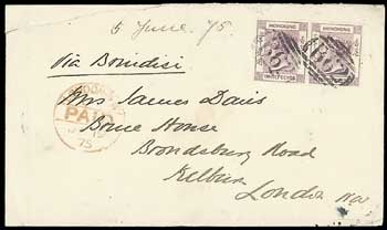 136 : width="300p" alt="image" ></a></cfif>x HONG KONG 1875 (5 June) envelope from Hong Kong to Mrs James Davis in London, marked "Via Brindisi", bearing 30c. mauve pair cancelled by "B62" obliterators, showing red arrival d.s. (19.7) at left and blue