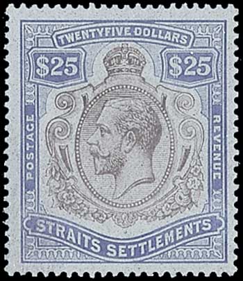 136 : width="300p" alt="image" ></a></cfif>x Malaya and States Straits Settlements — $25 purple and blue on blue, fine unmounted mint. Sc. 202; S.G. 240b, £700 Estimate £ 350-400<A