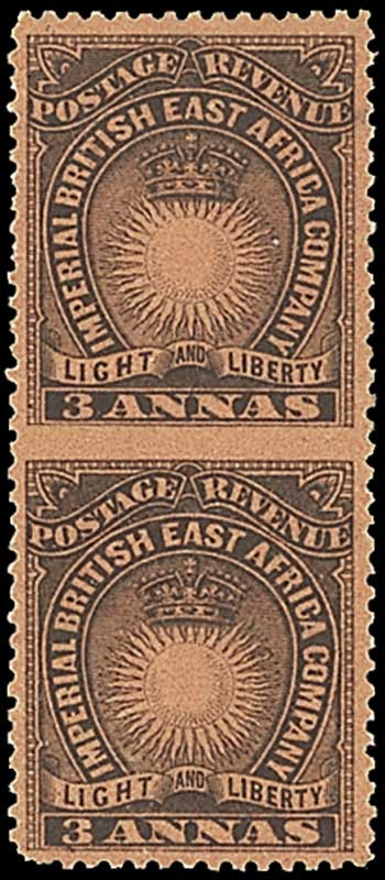 136 : width="300p" alt="image" ></a></cfif>xBritish East Africa 1890-95 IBEA Company Definitives 3a. black on bright red vertical pair, variety imperforate between, fresh unused with large part original gum. B.P.A. Certificate (2003). Sc. 18c; S.G. 8ad,