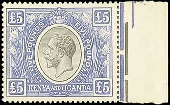 136 : width="300p" alt="image" ></a></cfif>xKenya, Uganda and Tanganyika 1922-27 Issue High Values £5 black and blue, a marginal example from the right of the sheet, fresh and very lightly mounted mint. Scarce. B.P.A. Certificate (1999). Sc. 41;