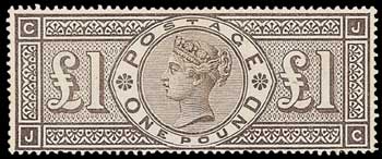 136 : width="300p" alt="image" ></a></cfif>x Great Britain Surface-Printed Issues 1884 One Pound Brown-Lilac, Watermark Crowns JC, variety broken frame, part original gum (a little disturbed); trace of lightly pressed crease/wrinkle though otherwise fine.