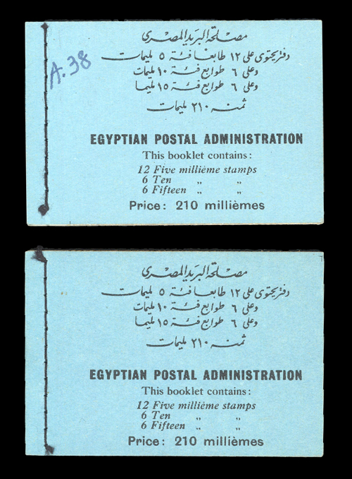 136 : SRC="https://d3ums4016ncdkp.cloudfront.net/auction/main/5011/5011_2322_1.jpg" width="300p" alt="image" ></a></cfif>Egypt Booklets 1939 210m. black on blue stitched at left complete (2), one with panes showing "A/38" controls, good perforations;