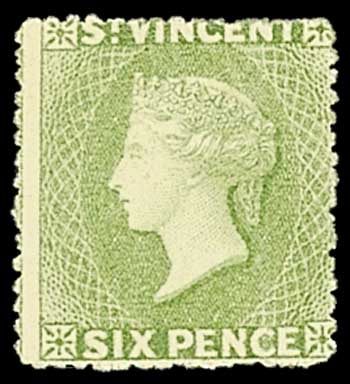 136 : width="300p" alt="image" ></a></cfif>x St. Vincent 1877-78 Wmk. Small Star (sideways), Perf. about 15 6d. pale green, unused with part original gum, a "small" example centered to upper right, fine. S.G. 26, £1600. Photo Estimate £