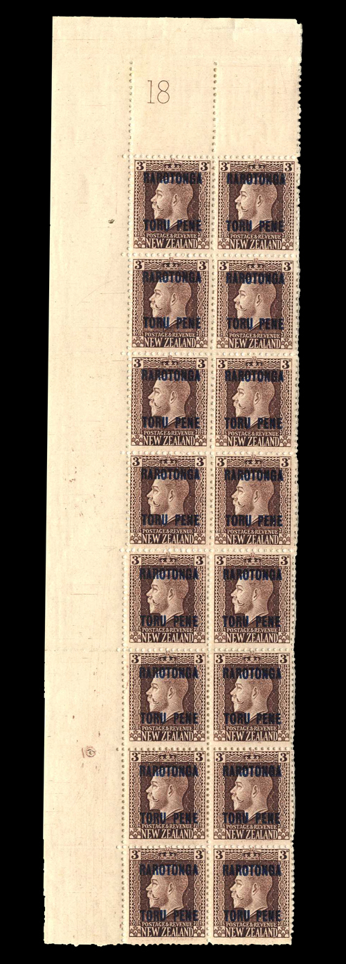 136 : width="300p" alt="image" ></a></cfif>Cook Islands 1919 Engraved Issue 3d. Plate 18 upper left corner block of sixteen incorporating a two-perf. block of four, fine mint Estimate £ 100-120<A