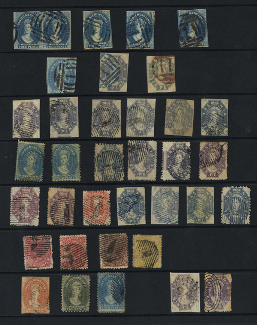 137 : 6d.), 1860-67 6d. shades (9), perforated Chalons (12) and Sidefaces (4) cancelled with Melbourne think "1" in thin circle of bars; also 1868 6d. cancelled with New South Wales sunburst "94" and later 6d. cancelled "N.S.W." in eliptical ovals. An